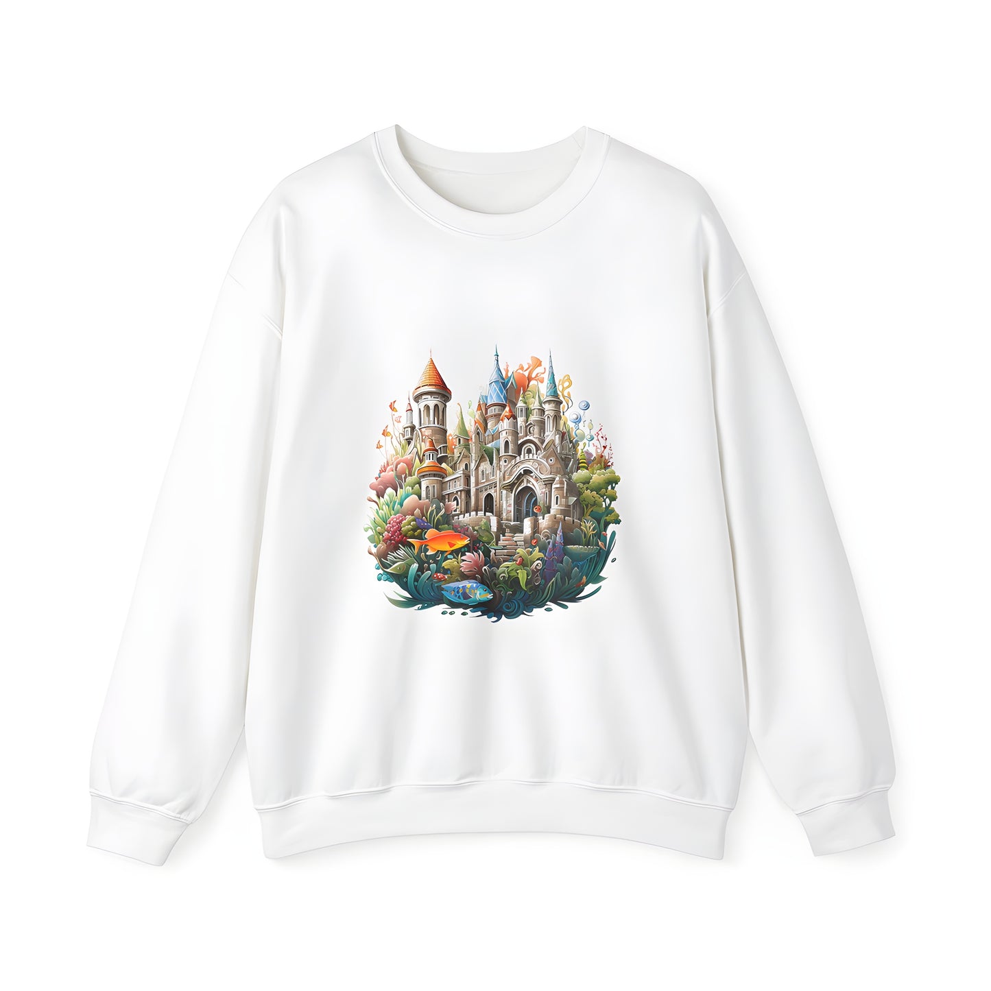 - Dive into fantasy with our Adult Crewneck Sweatshirt, showcasing a whimsical underwater castle surrounded by vibrant marine life. Perfect for art lovers seeking a splash of color and imagination.