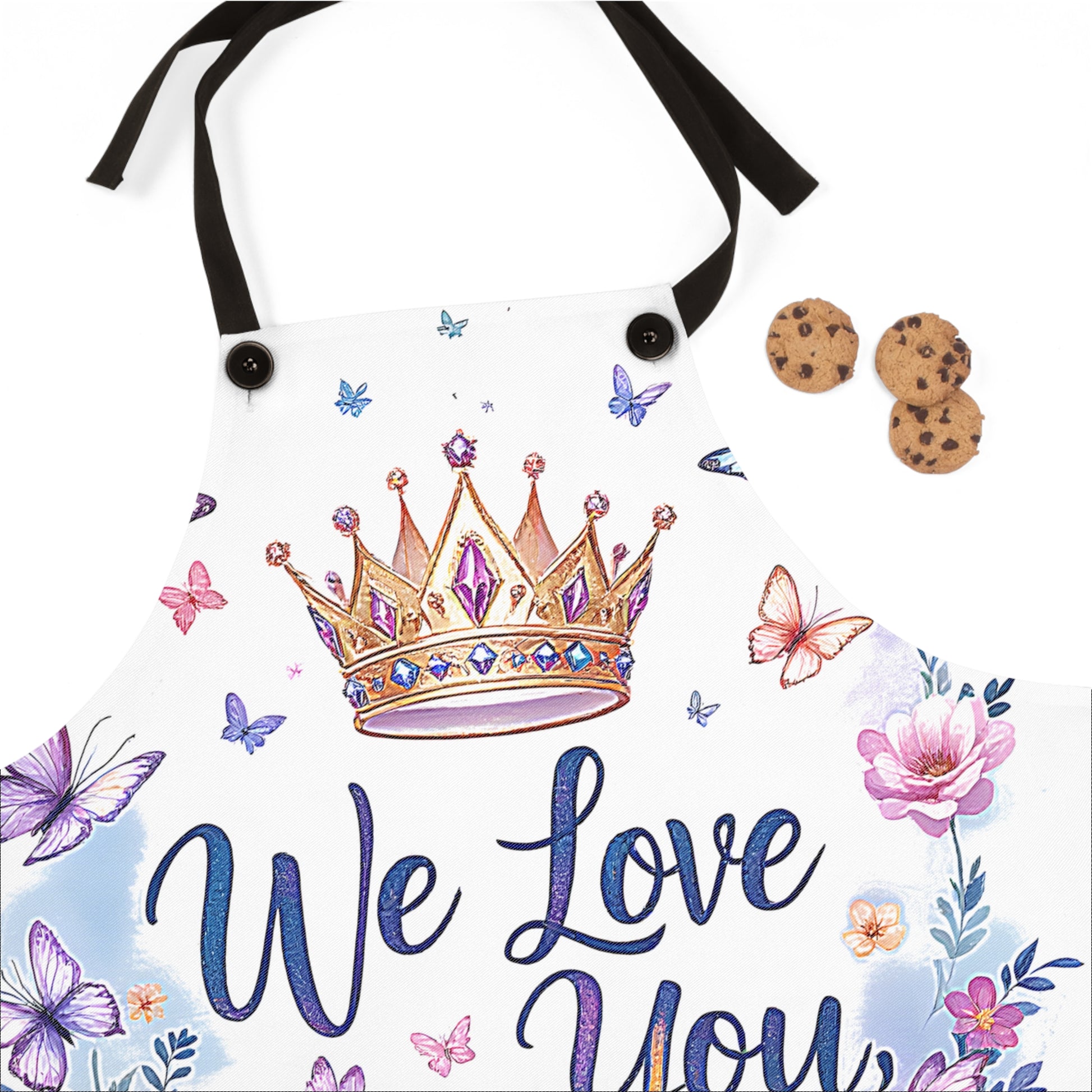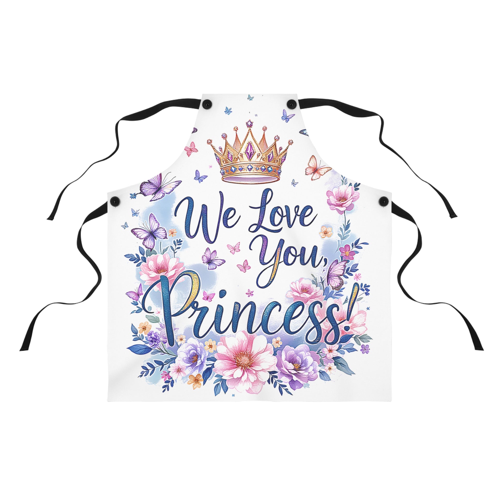 - Embrace regal elegance with our apron, adorned with a crown and vibrant butterflies, perfect for those who cherish the charm of a princess-inspired celebration.