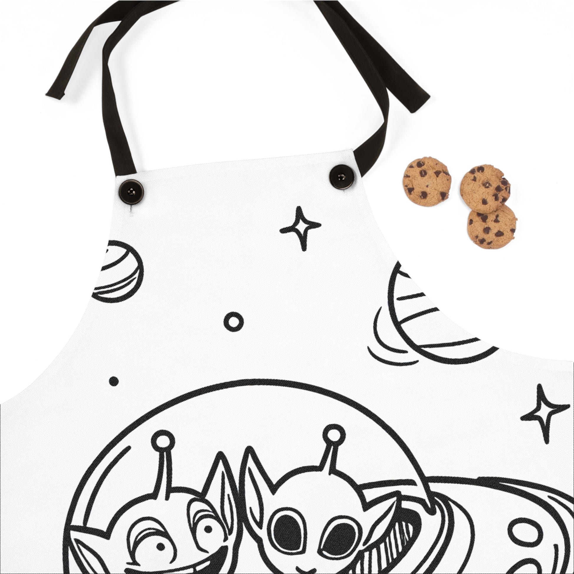 - Embark on a cosmic journey with our apron featuring two charming aliens navigating the galaxy, perfect for art enthusiasts who love whimsical and adventurous designs.