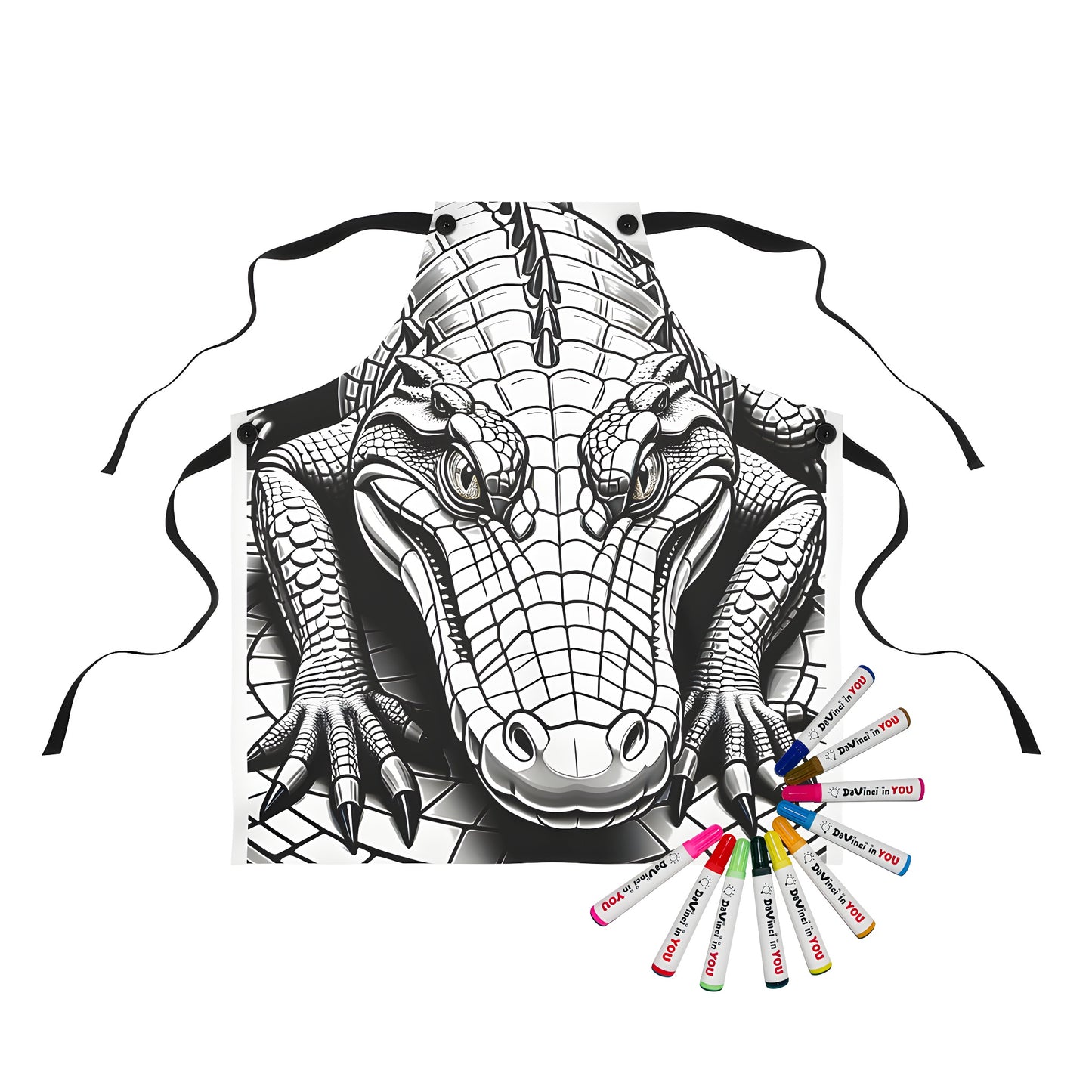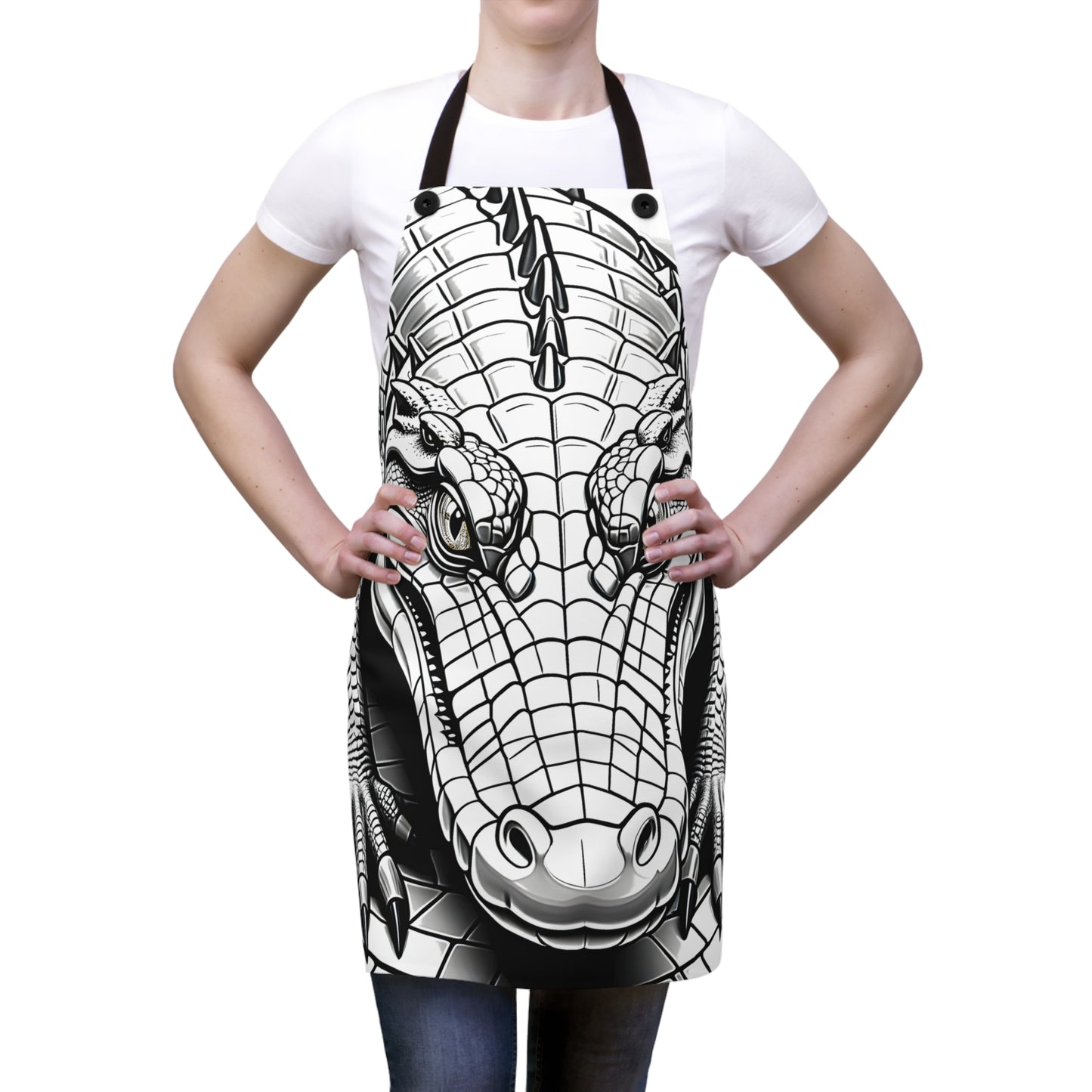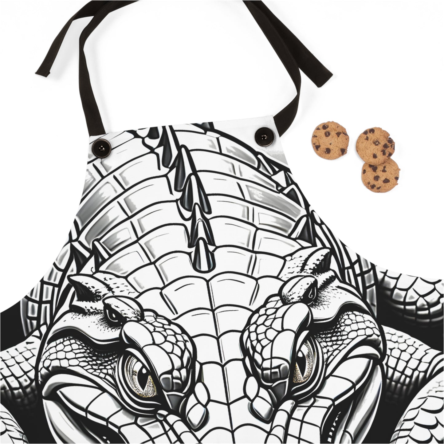 - **Intricate Crocodile Illustration Apron**: Showcase your love for detailed art with this black and white apron featuring a meticulously drawn crocodile, highlighting its textured scales and sharp claws. Perfect for art enthusiasts who appreciate fine craftsmanship.