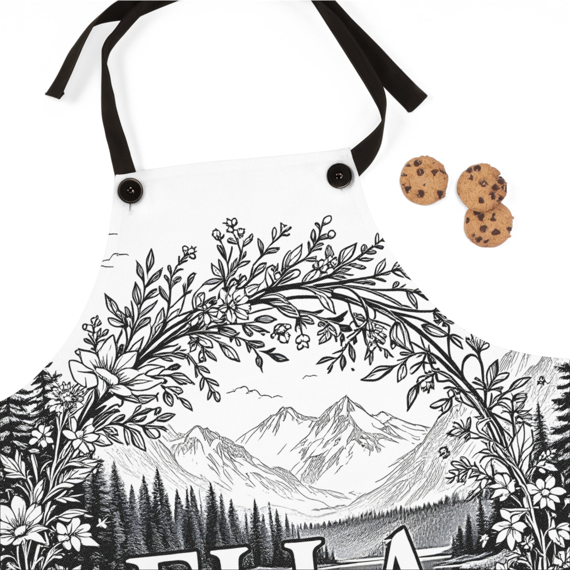 - Embrace tranquility with our 'Ella' apron, featuring a serene black and white floral wreath against a mountain and lake backdrop, perfect for nature-loving art enthusiasts.