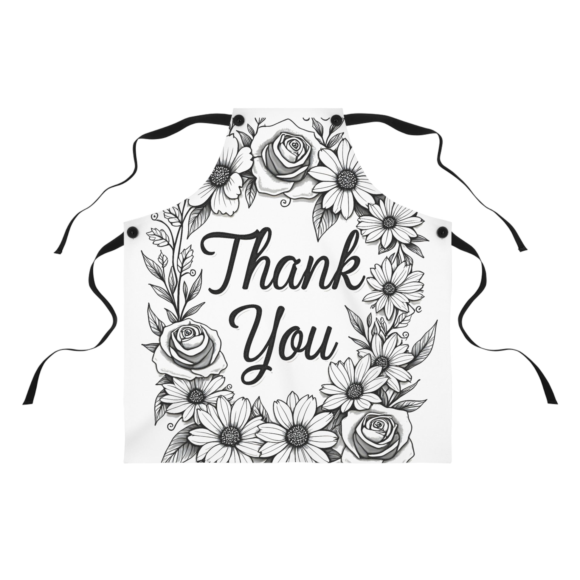 - **Express Gratitude with Elegance**: This apron showcases a sophisticated black and white floral wreath, featuring intricate roses and daisies encircling a heartfelt 'Thank You', perfect for art enthusiasts who appreciate detailed design.