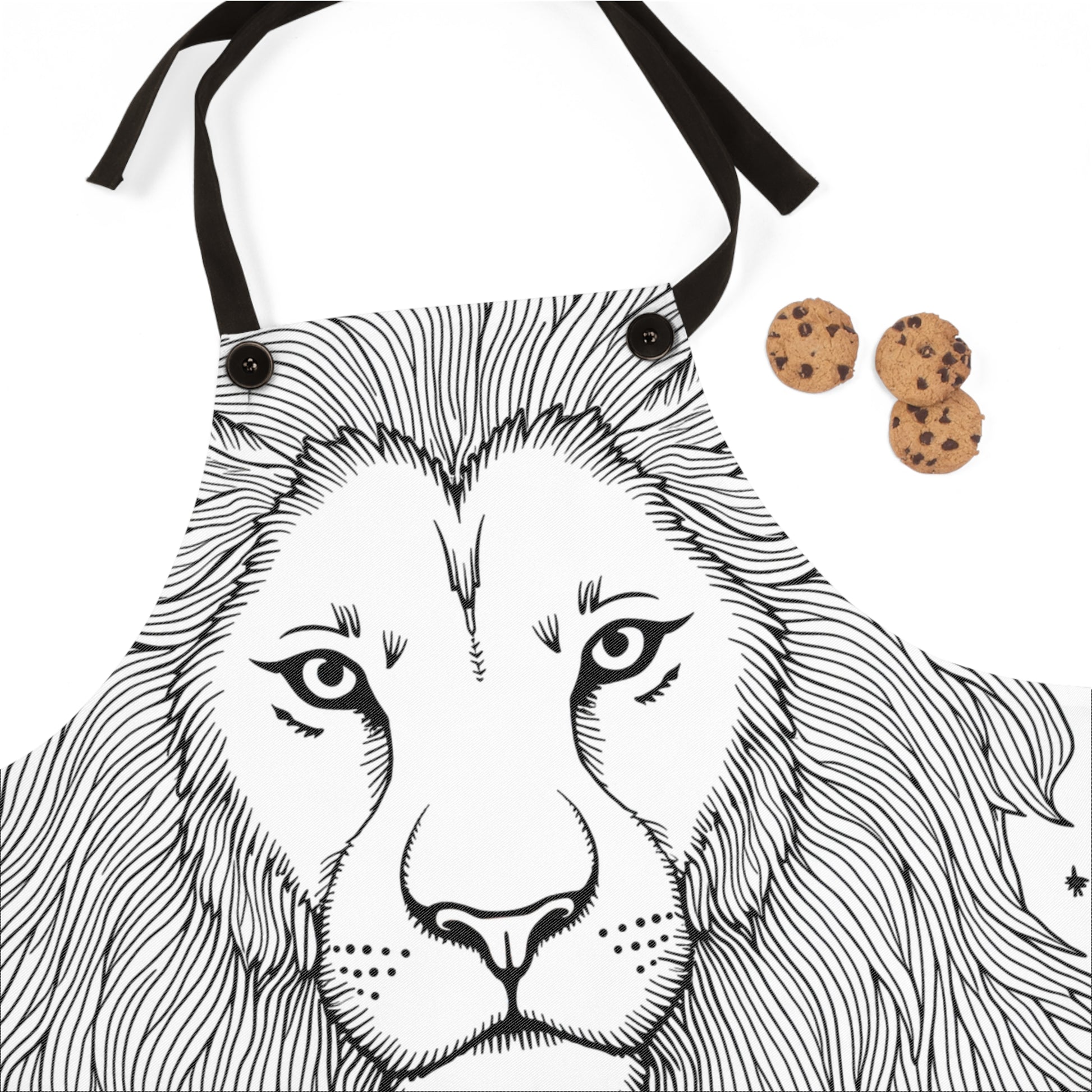 - Embrace the majestic allure of the lion with our apron, showcasing a detailed line drawing of a lion's head, surrounded by celestial stars and delicate flowers, perfect for art enthusiasts seeking a touch of wild elegance.