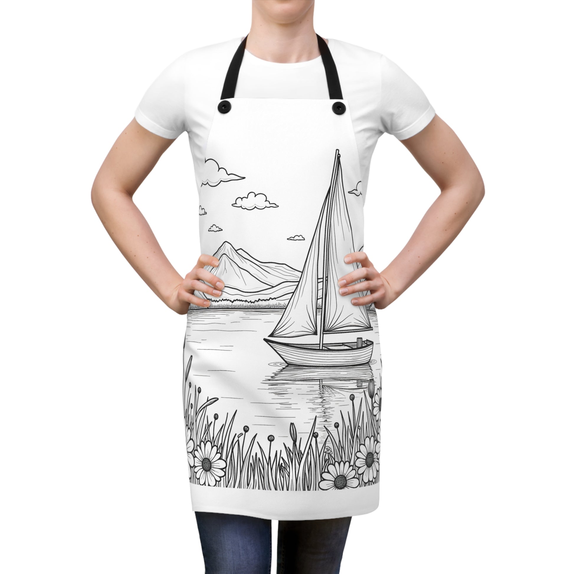 - Embrace tranquility with our apron featuring a serene sailboat scene, perfect for nature and art enthusiasts seeking a touch of peaceful elegance in their kitchen attire.