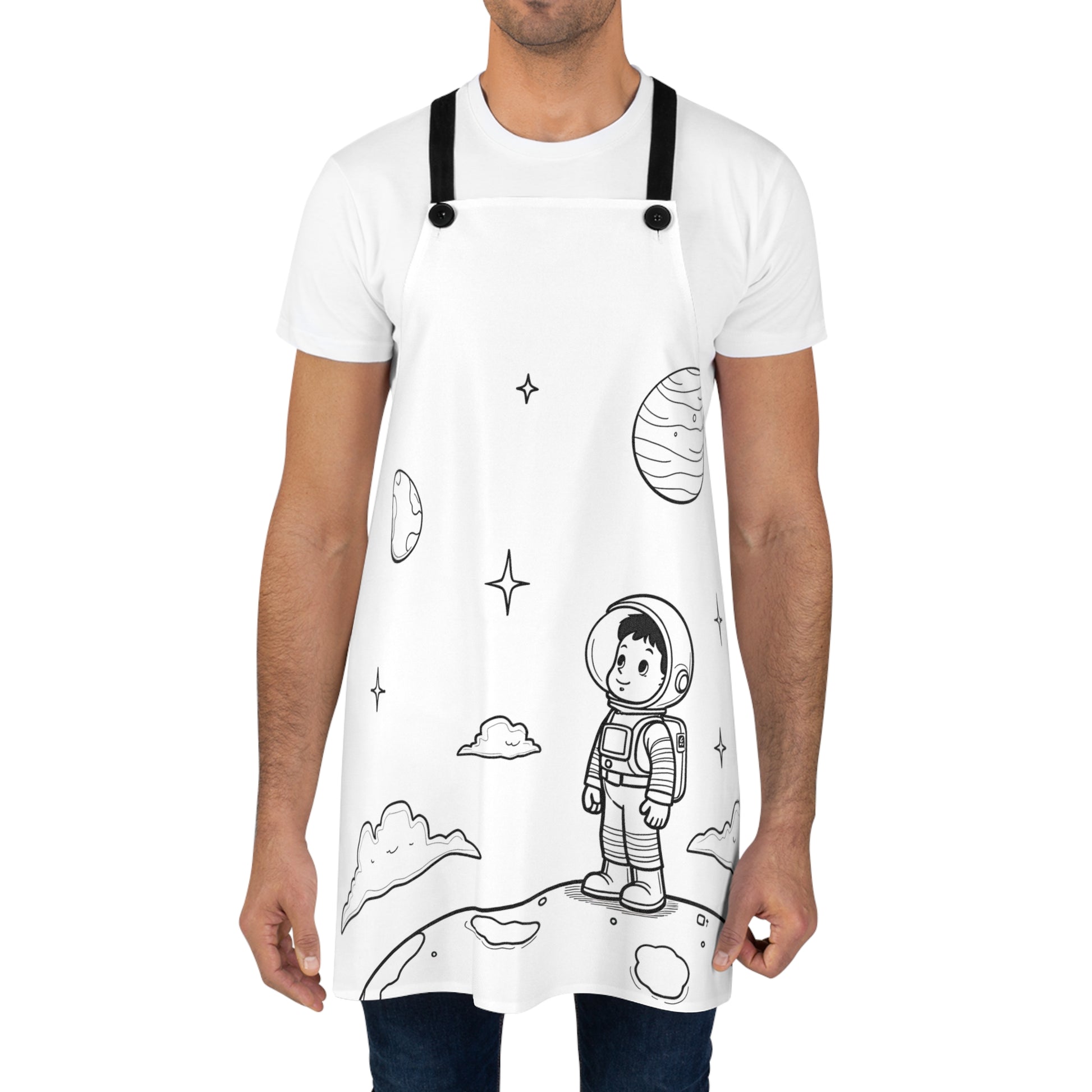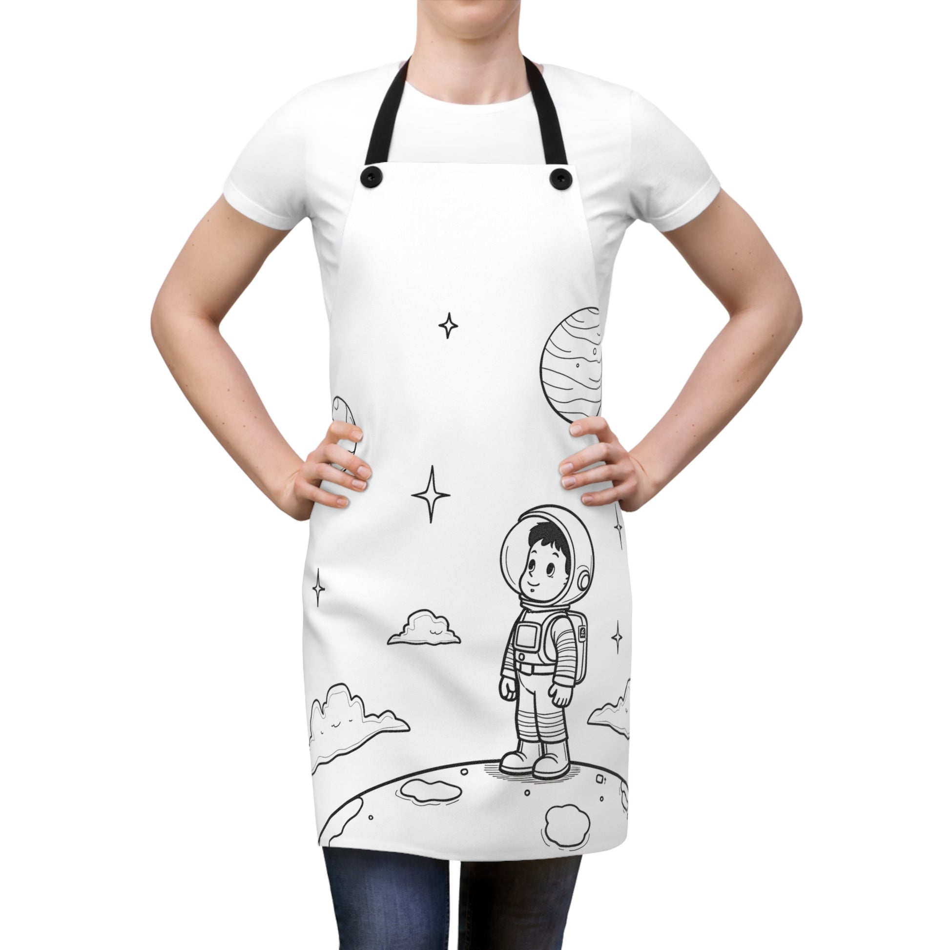 - Ignite your culinary adventures with our space-themed apron, featuring a young astronaut amidst a cosmic landscape, perfect for dreamers and explorers.
