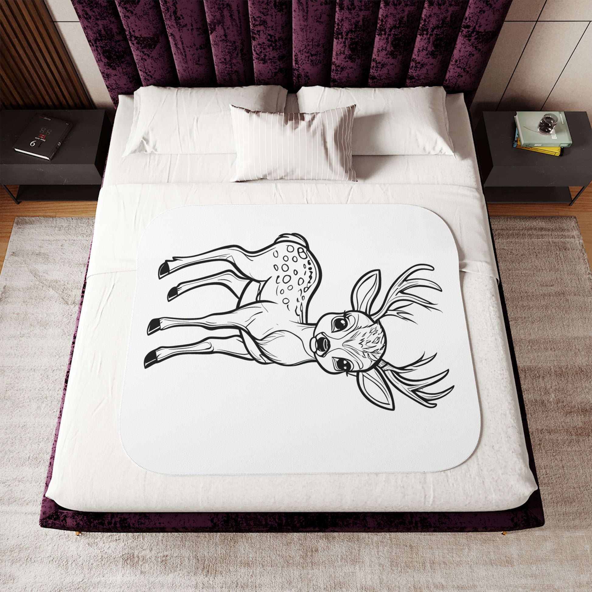 - **Graceful Elegance in Monochrome:** This blanket features a striking black and white illustration of a young deer with antlers, capturing the delicate beauty and slender form of nature's gentle creatures. Perfect for art enthusiasts seeking a touch of sophistication in home decor.