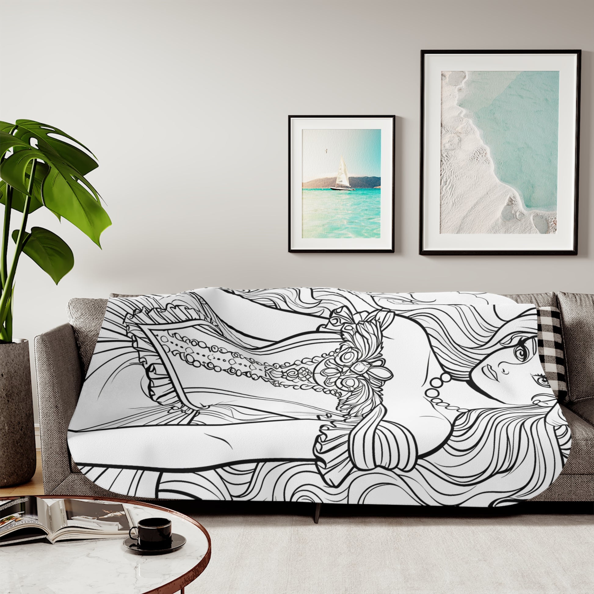 - **Regal Elegance in Every Detail**: This blanket features intricate line art of a graceful princess with flowing hair, standing amidst clouds and columns, perfect for art lovers seeking a touch of sophistication and fantasy in their home decor.
