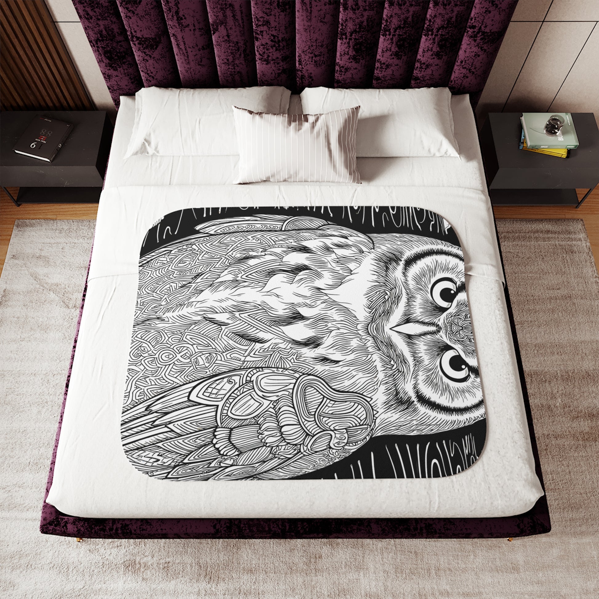 - Embrace the elegance of nature with our intricately designed owl blanket, featuring detailed patterns and textures that bring the majestic bird to life amidst lush foliage. Perfect for art enthusiasts seeking a touch of sophistication in their home decor.