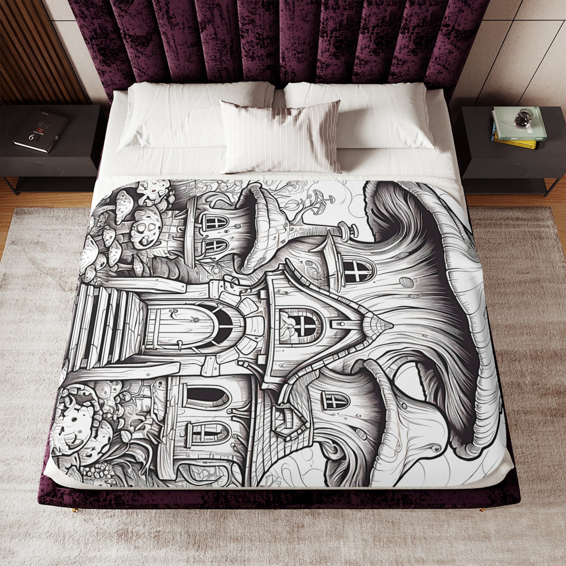 - Enchanting fantasy woodland mushroom house illustration, perfect for art lovers seeking a whimsical, detailed blanket design.