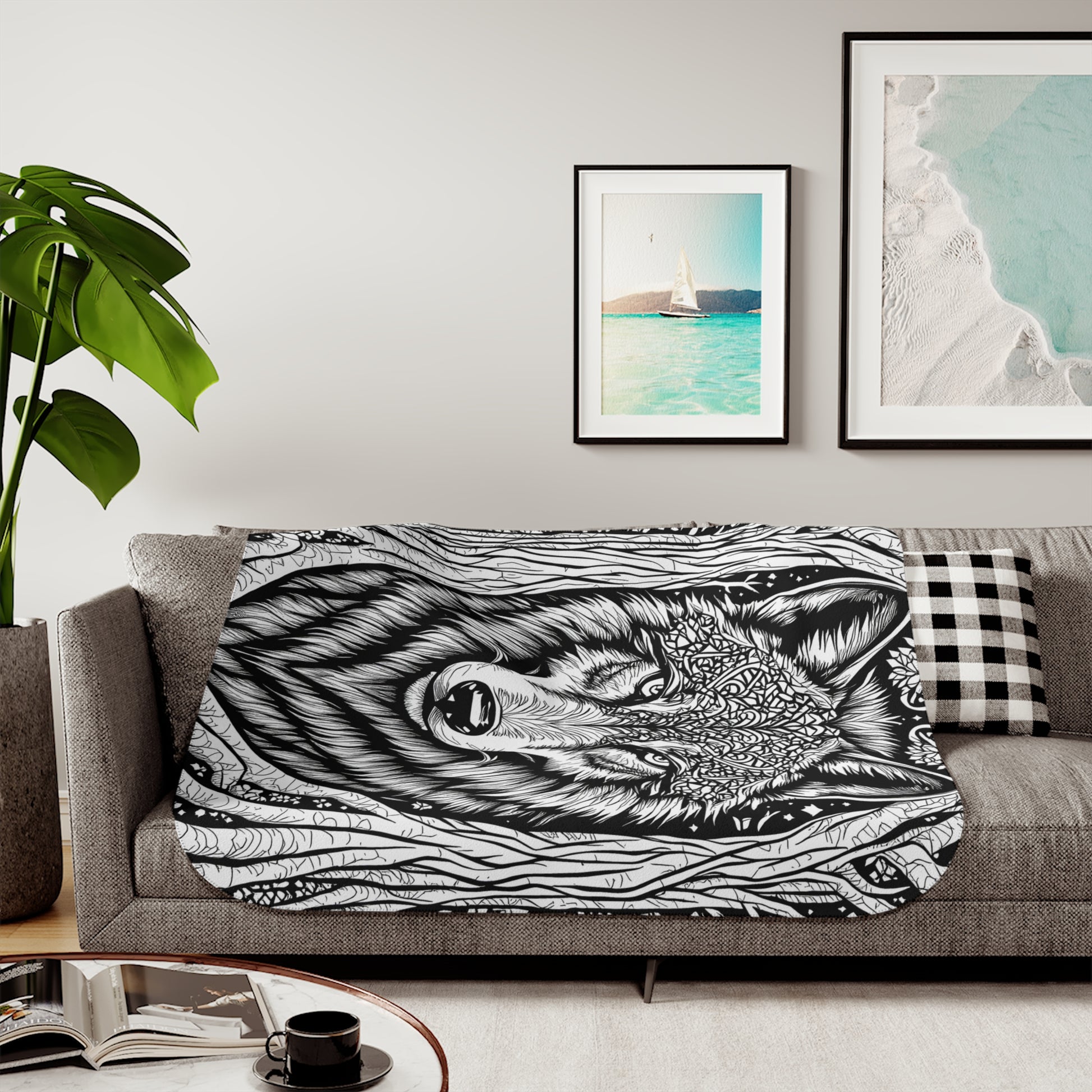 - Embrace the wild elegance: This blanket features a detailed wolf illustration with intricate patterns, framed by entwined trees, merging wildlife allure with artistic sophistication. Perfect for art enthusiasts seeking a unique, nature-inspired touch.