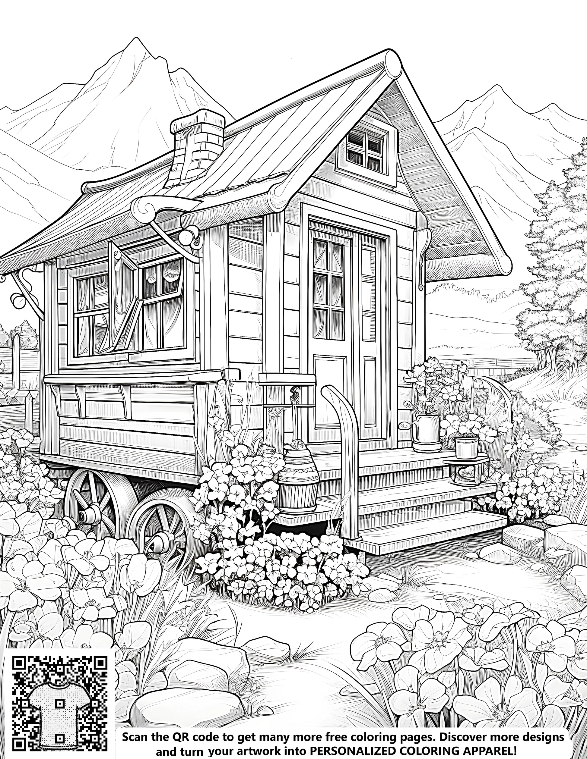 FREE Cozy Wooden Cottage Coloring Page - Printable Scenic Garden with Mountains Download
