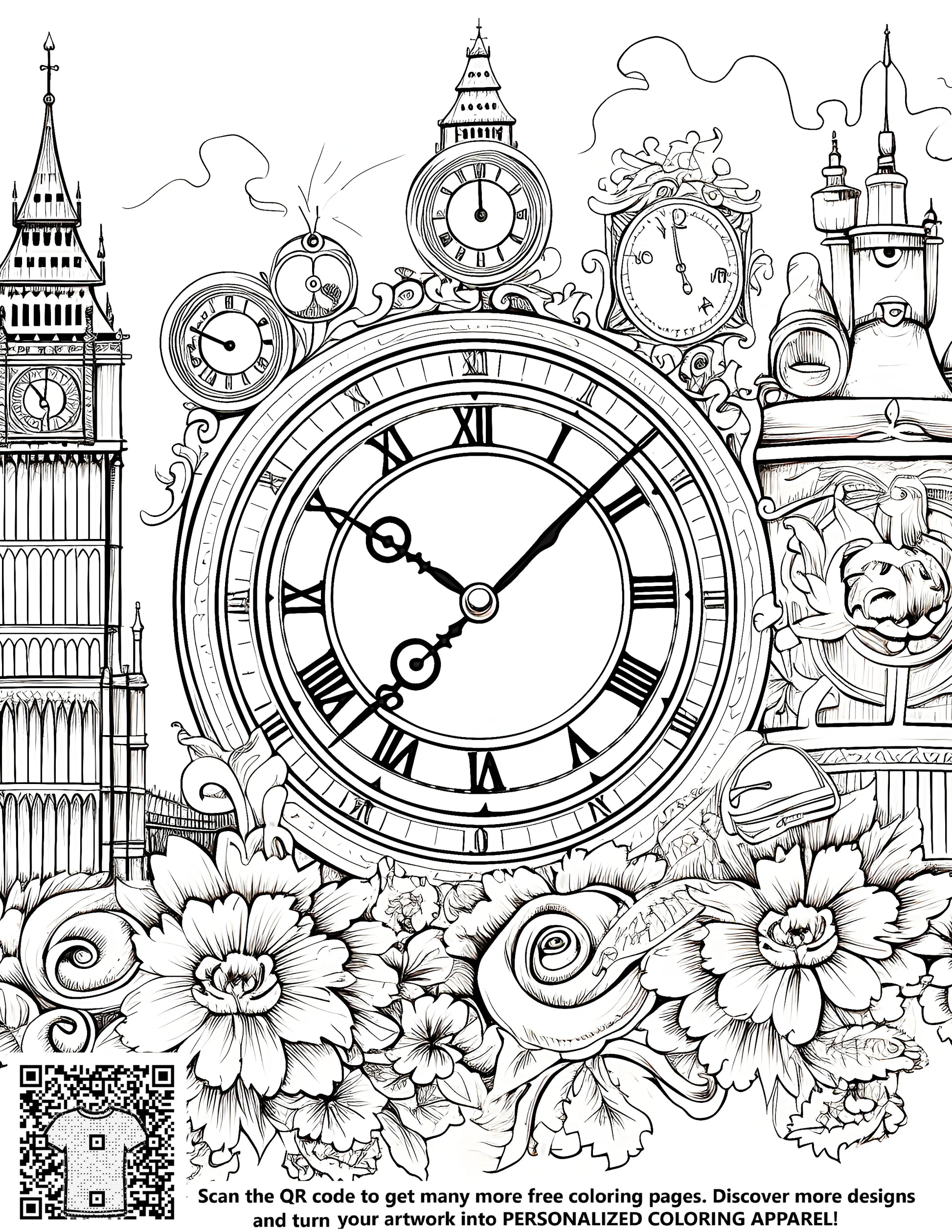 FREE Printable Coloring Page - Big Ben, Clocks, and Ornate Flowers Download