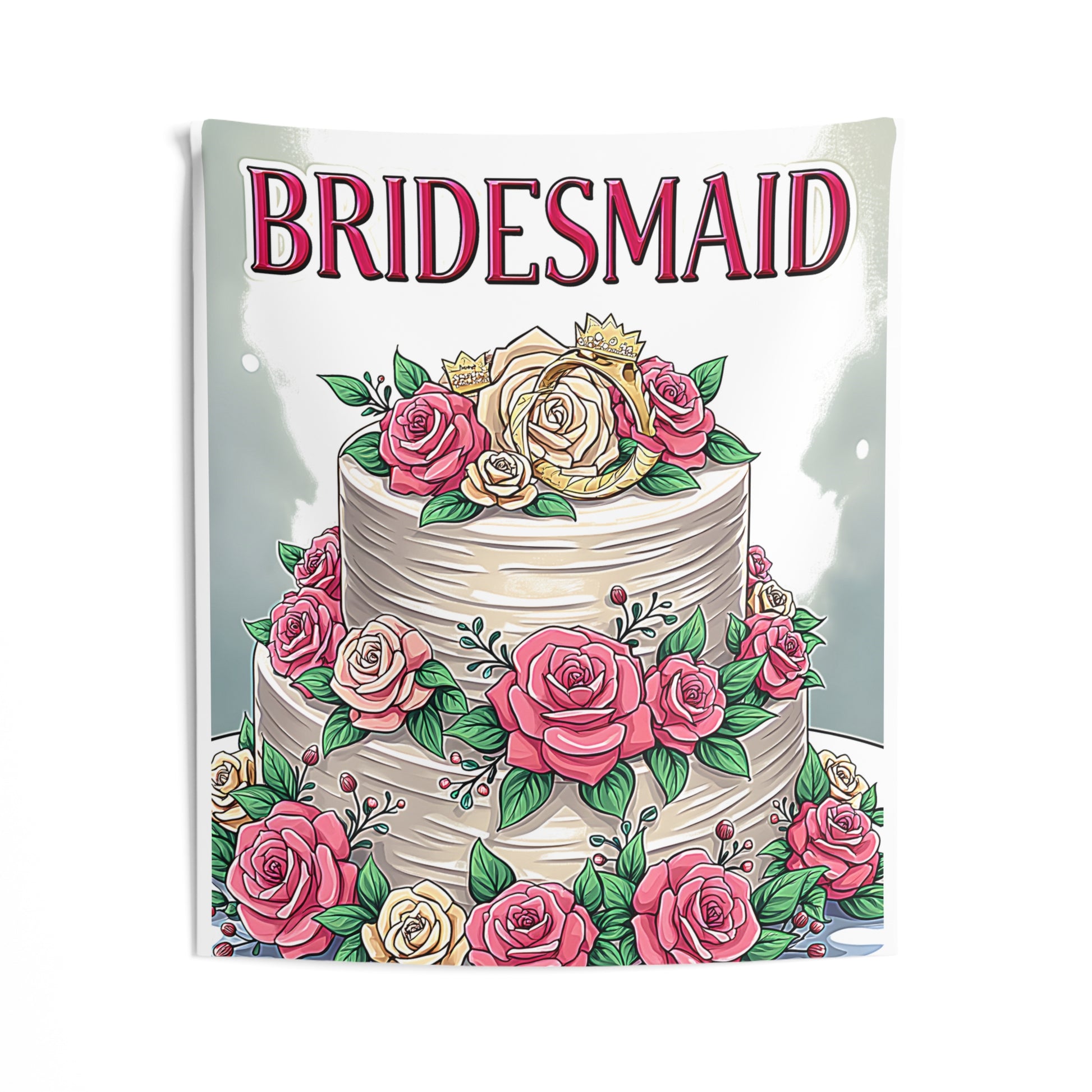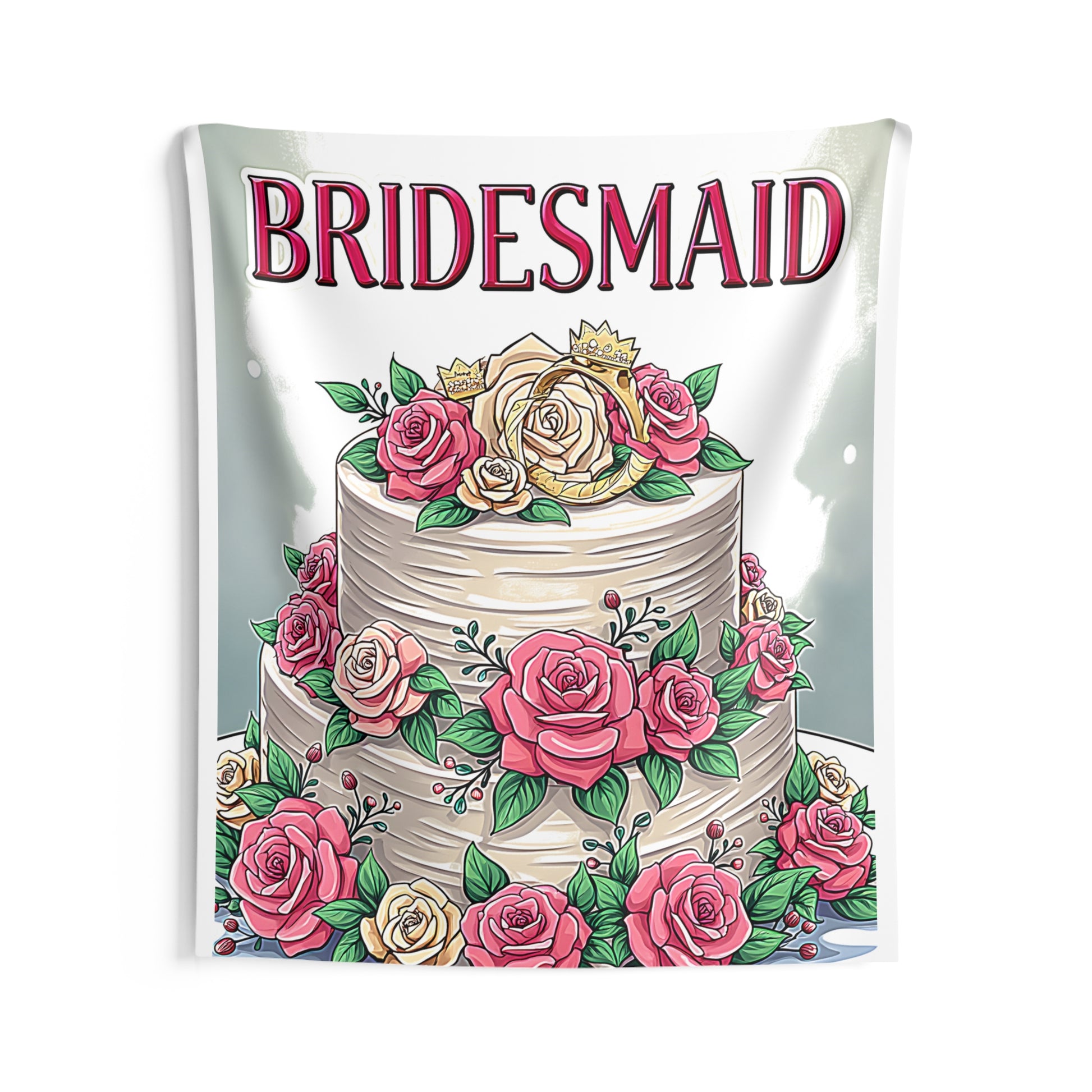 - Celebrate love and friendship with a wedding-themed tapestry featuring elegant pink roses and regal gold crowns, perfect for bridesmaid gifts.