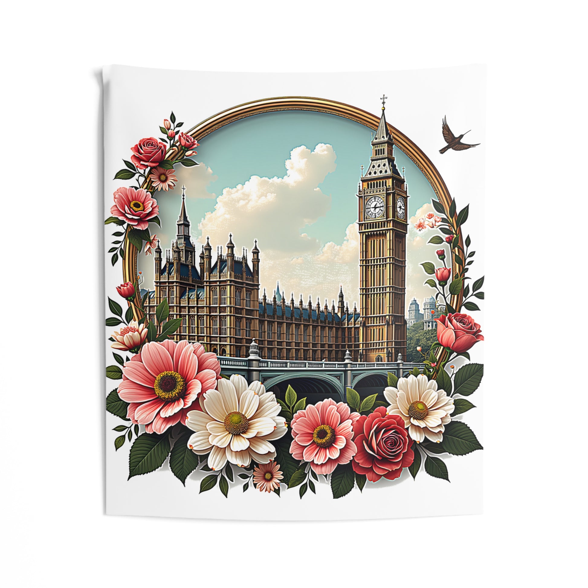 - Transform your space with a tapestry showcasing architectural elegance intertwined with nature's vibrancy, perfect for art enthusiasts seeking a harmonious blend of classic beauty and floral charm.