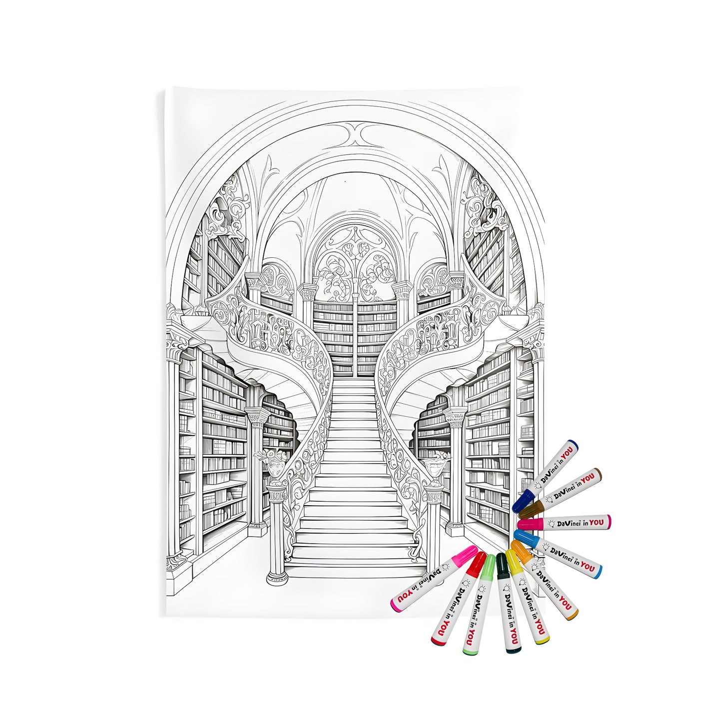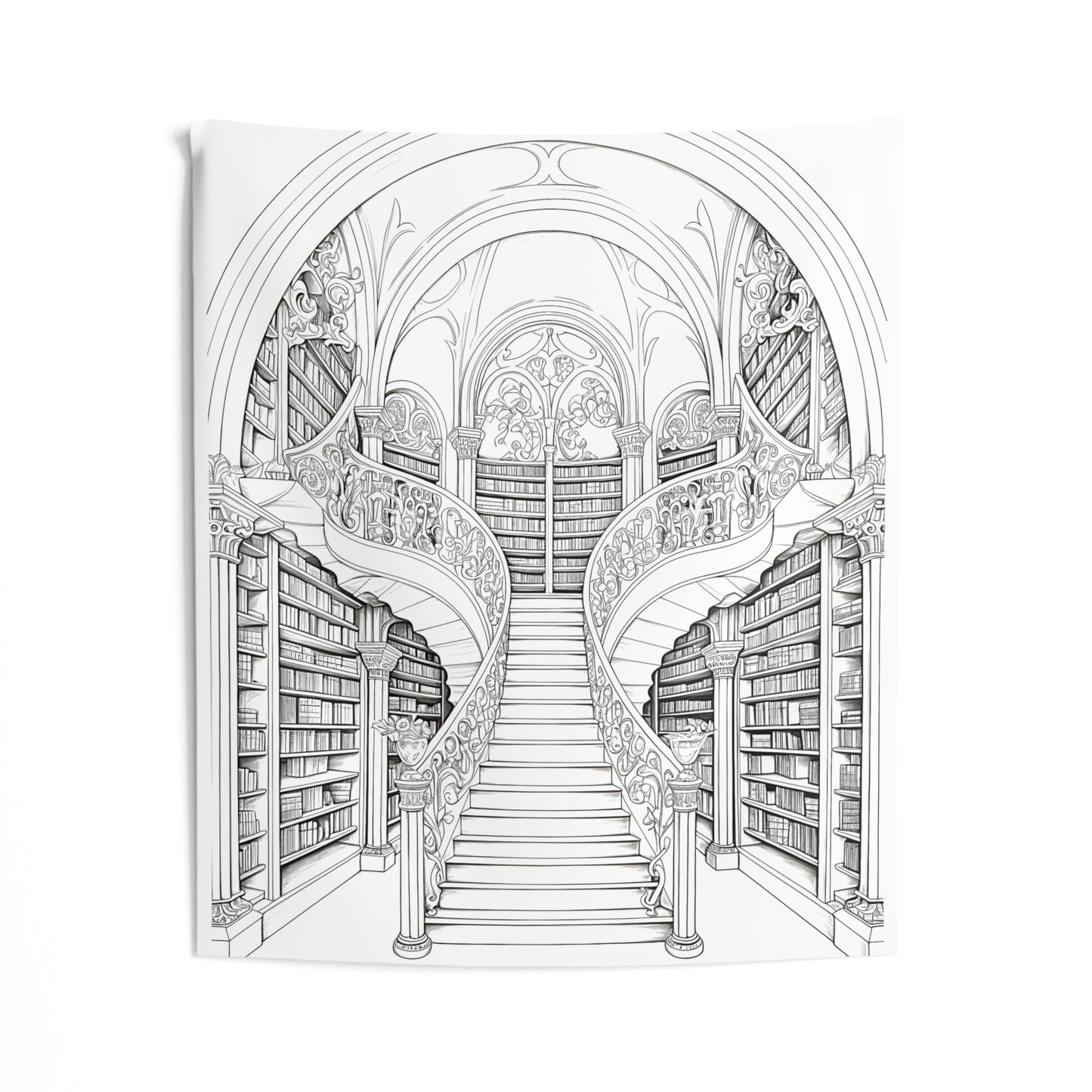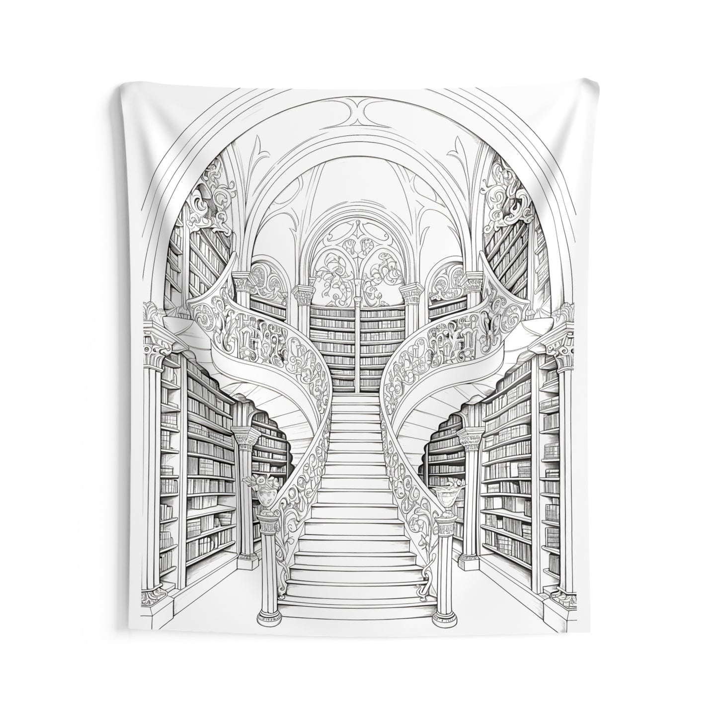 - Transform your space with an intricate black and white tapestry showcasing a grand library, perfect for book lovers and art enthusiasts alike.