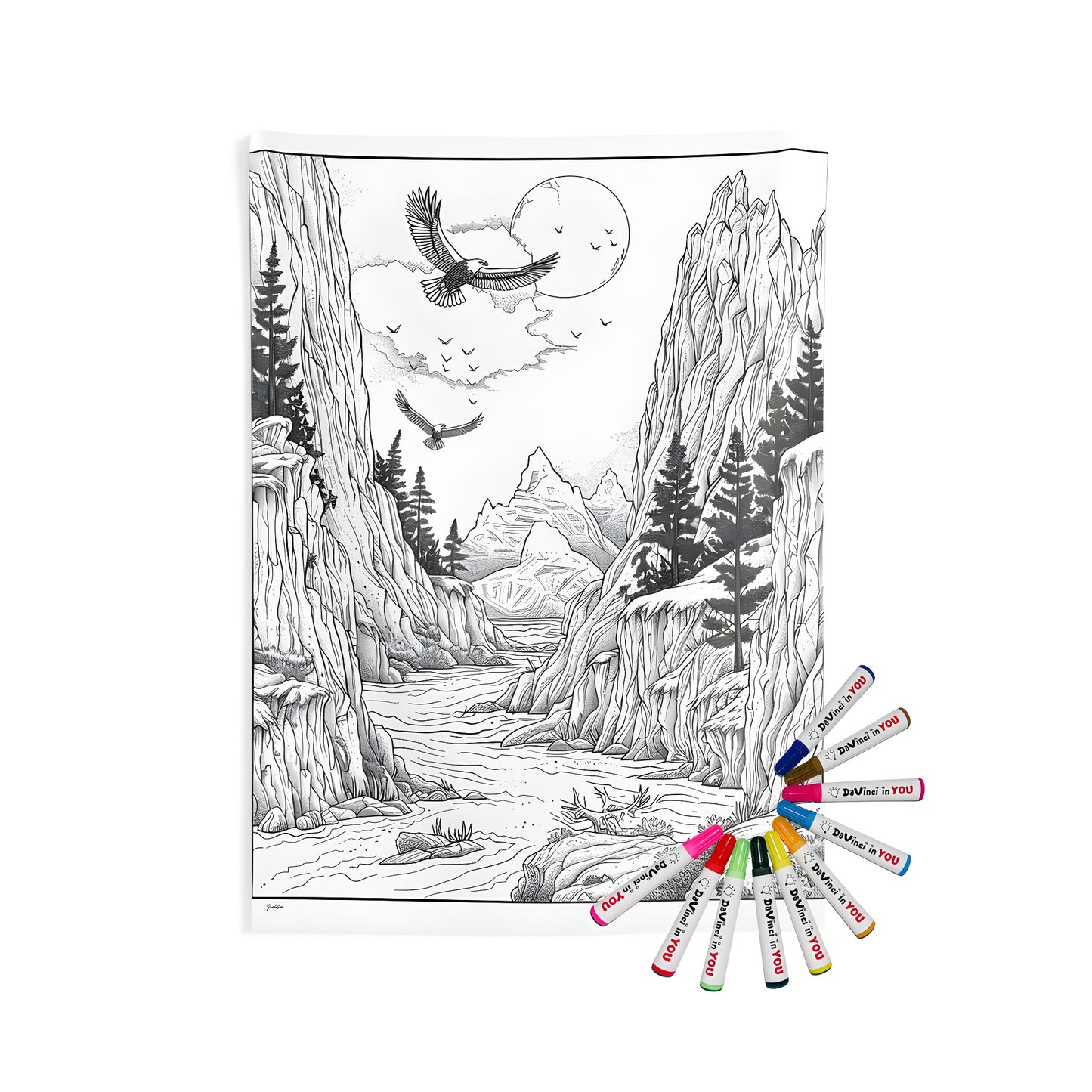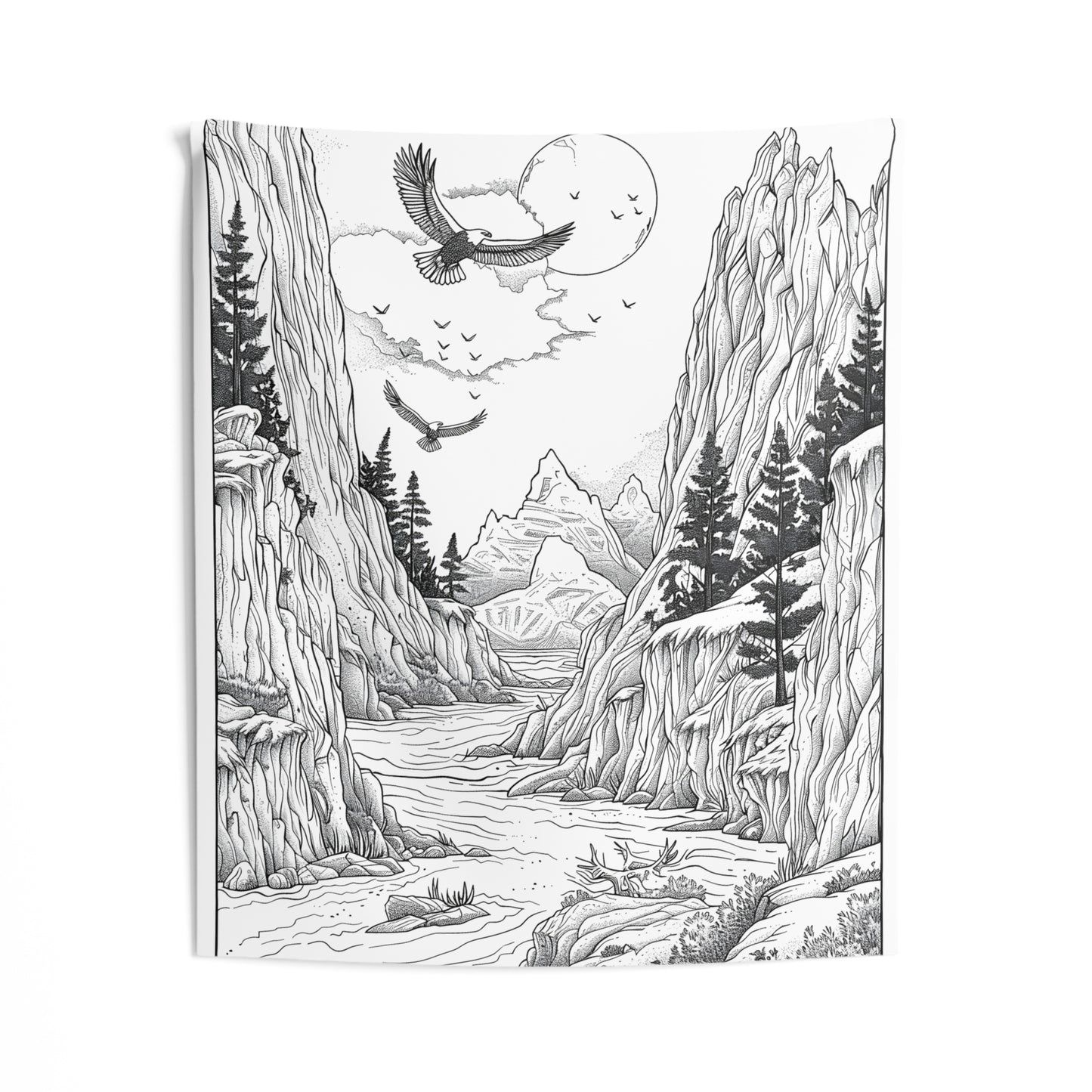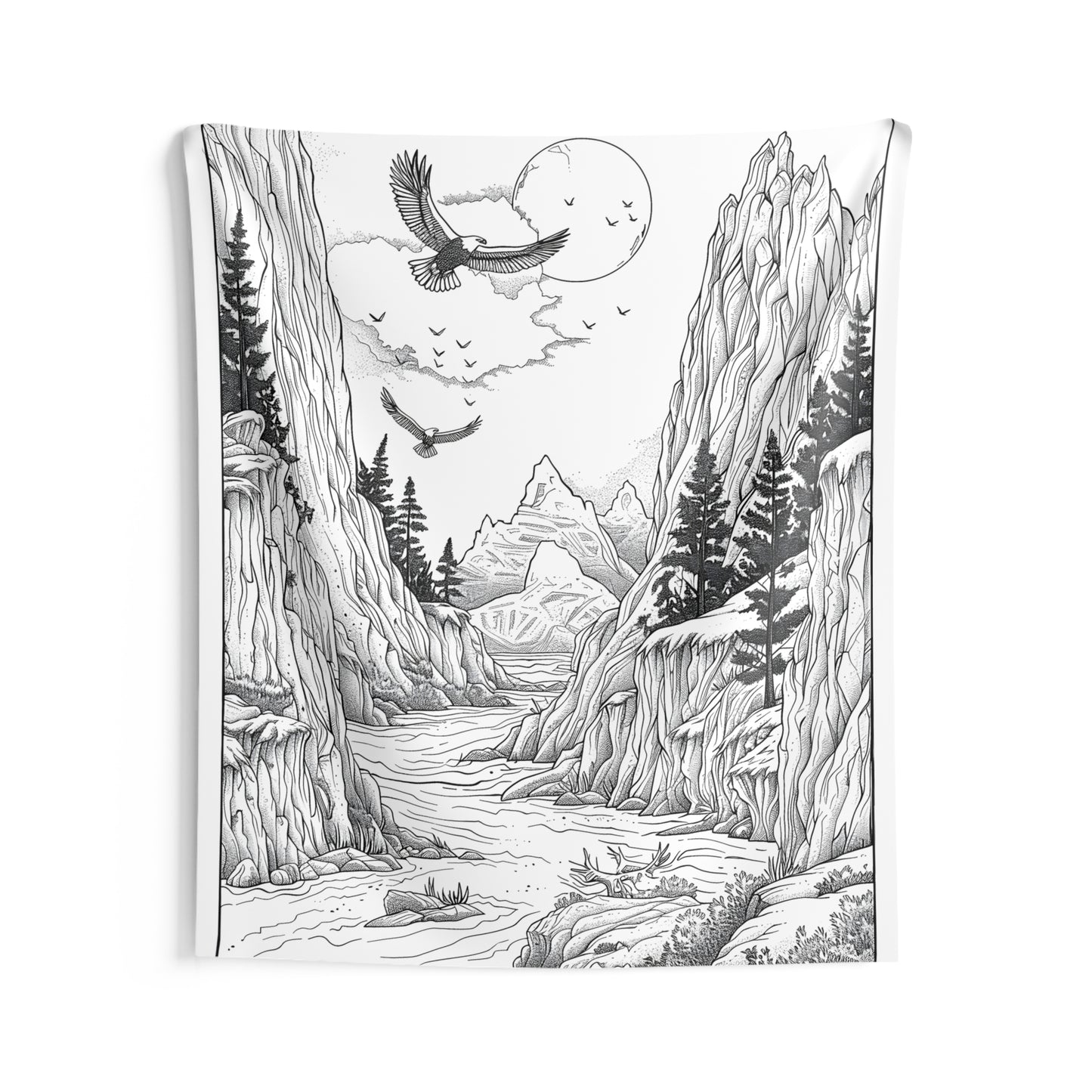 - **Majestic Mountain Scenery**: Elevate your space with this black and white tapestry featuring soaring eagles, a serene river, and towering pine trees in a picturesque valley, perfect for nature enthusiasts and art lovers.