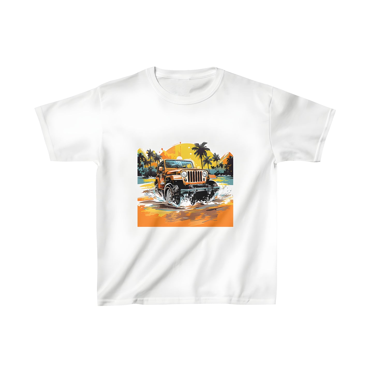 - **Vibrant Adventure Tee:** Capture the thrill of a tropical sunset with an orange Jeep splashing through beach waves, perfect for young explorers.