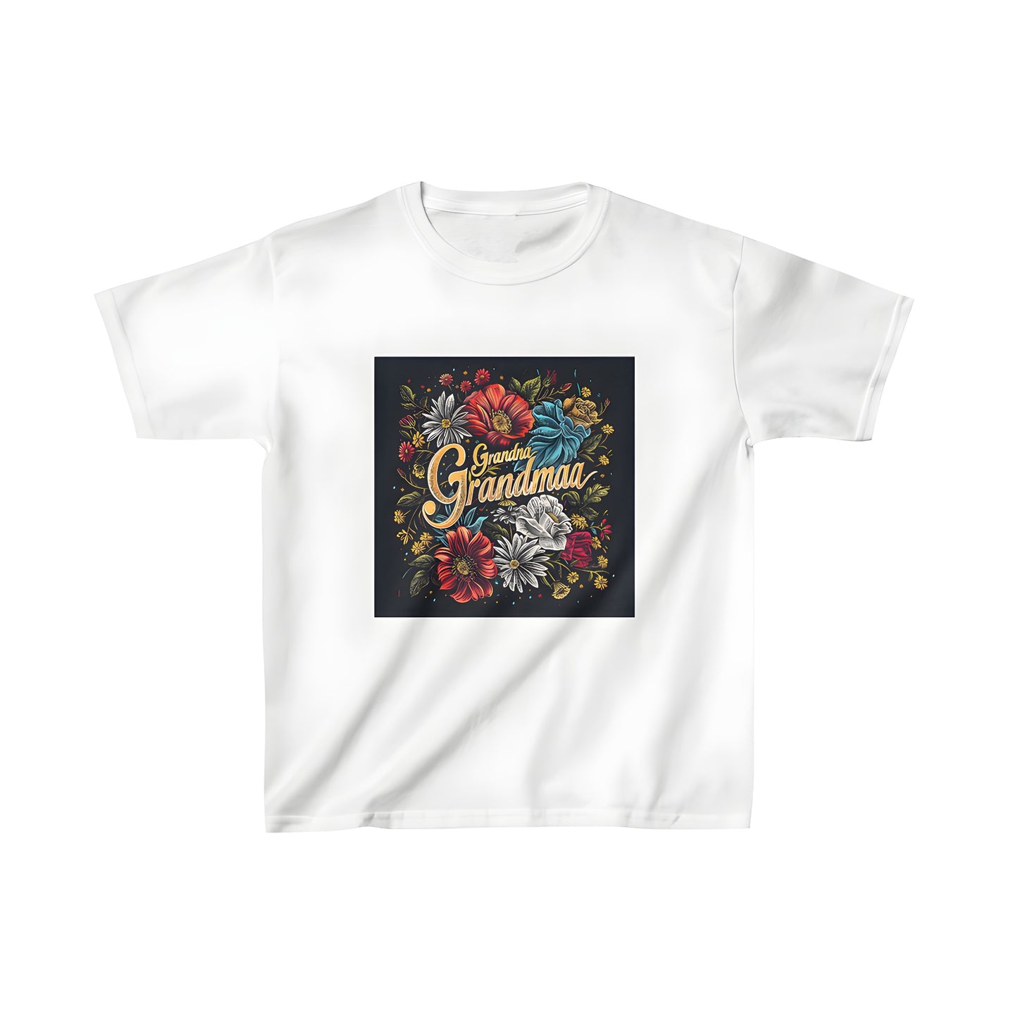 - Celebrate family love with our vibrant floral typography 'Grandma Grandmaa' kids t-shirt, adorned with detailed, colorful flowers and leaves. Perfect for art-loving little ones!