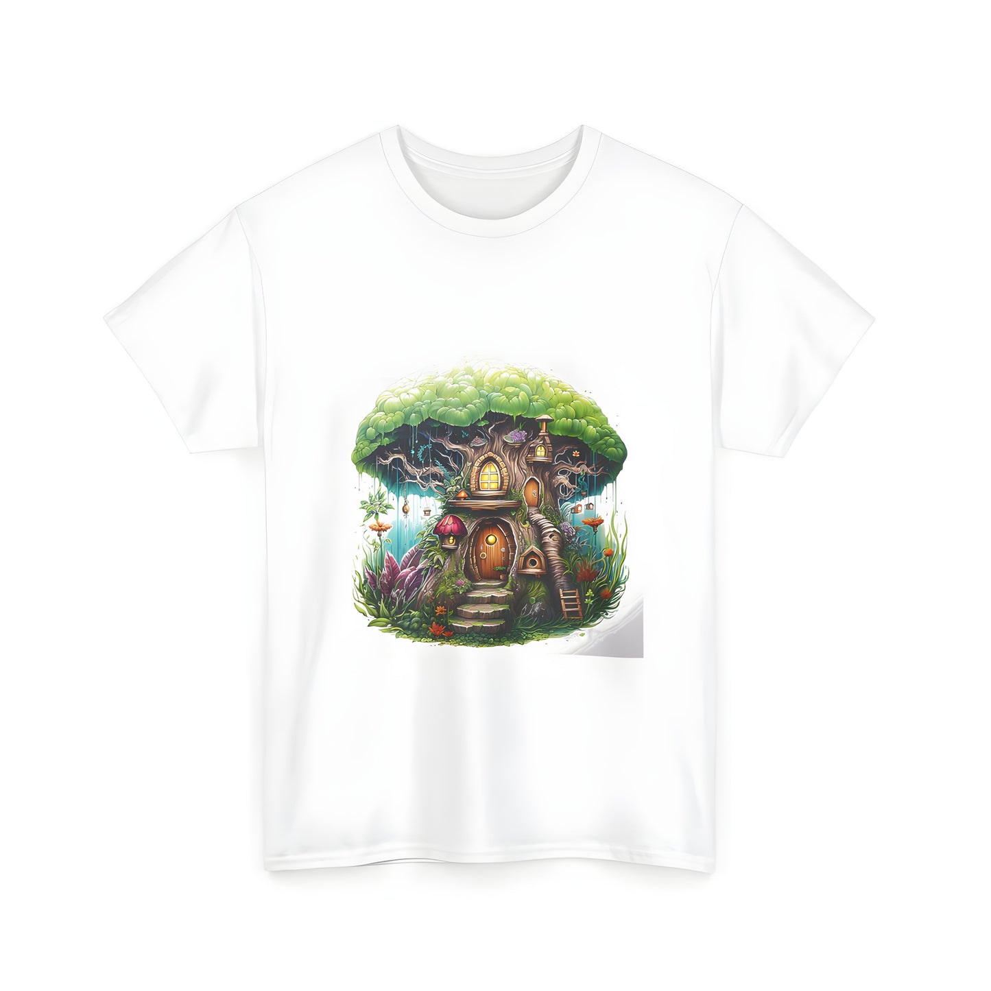 - Embrace the magic of a whimsical fantasy treehouse with glowing windows and vibrant plants on this unisex T-shirt, perfect for art lovers seeking a touch of enchantment.