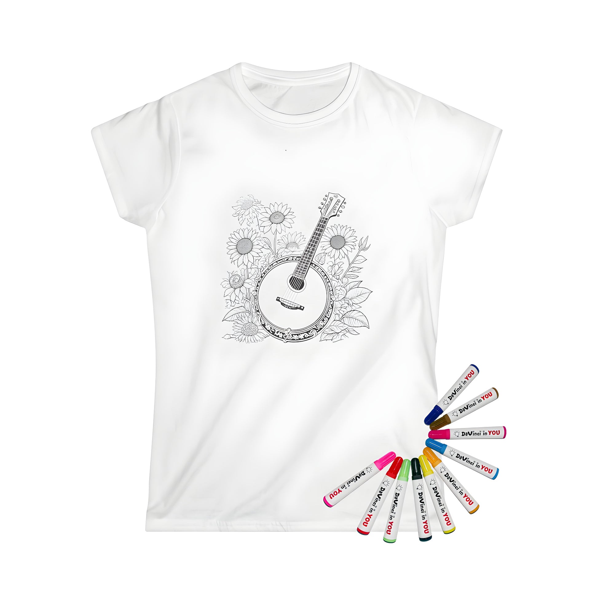 - Celebrate the harmony of music and nature with our Women's T-Shirt, showcasing a banjo entwined with vibrant sunflowers—perfect for art enthusiasts who appreciate the fusion of floral and musical themes.