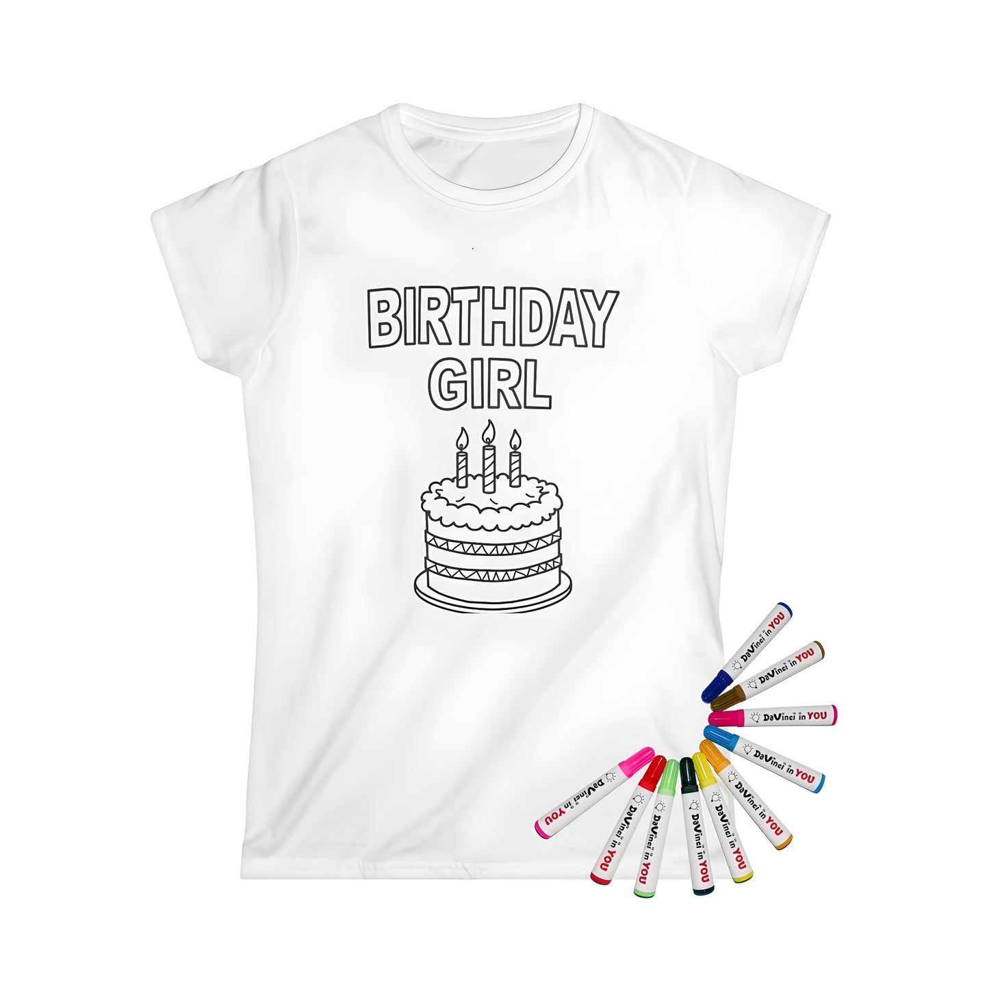 - Celebrate in style with our 'Birthday Girl' Women's T-Shirt featuring a charming line drawing of a birthday cake with three candles, perfect for art-loving fashionistas.